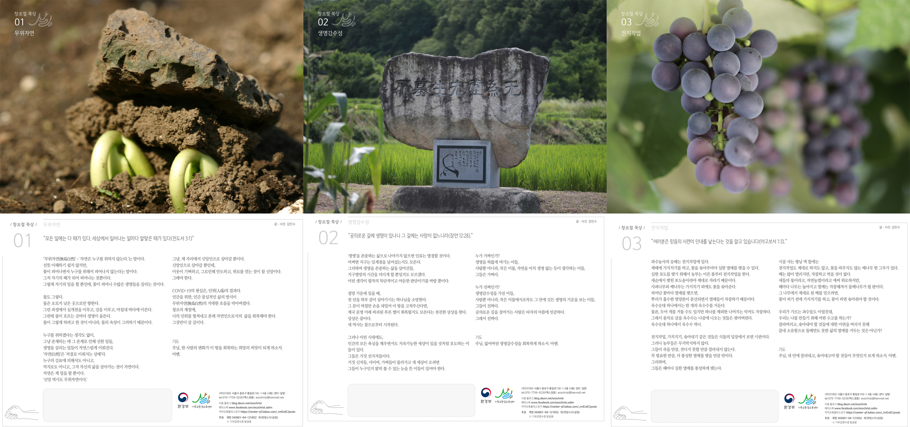 - <2020 창조절 생태묵상> 묵상이미지/글: https://eco-christ.tistory.com (9월 첫주일 이후부터 평일 하루씩 묵상카드 업로드)