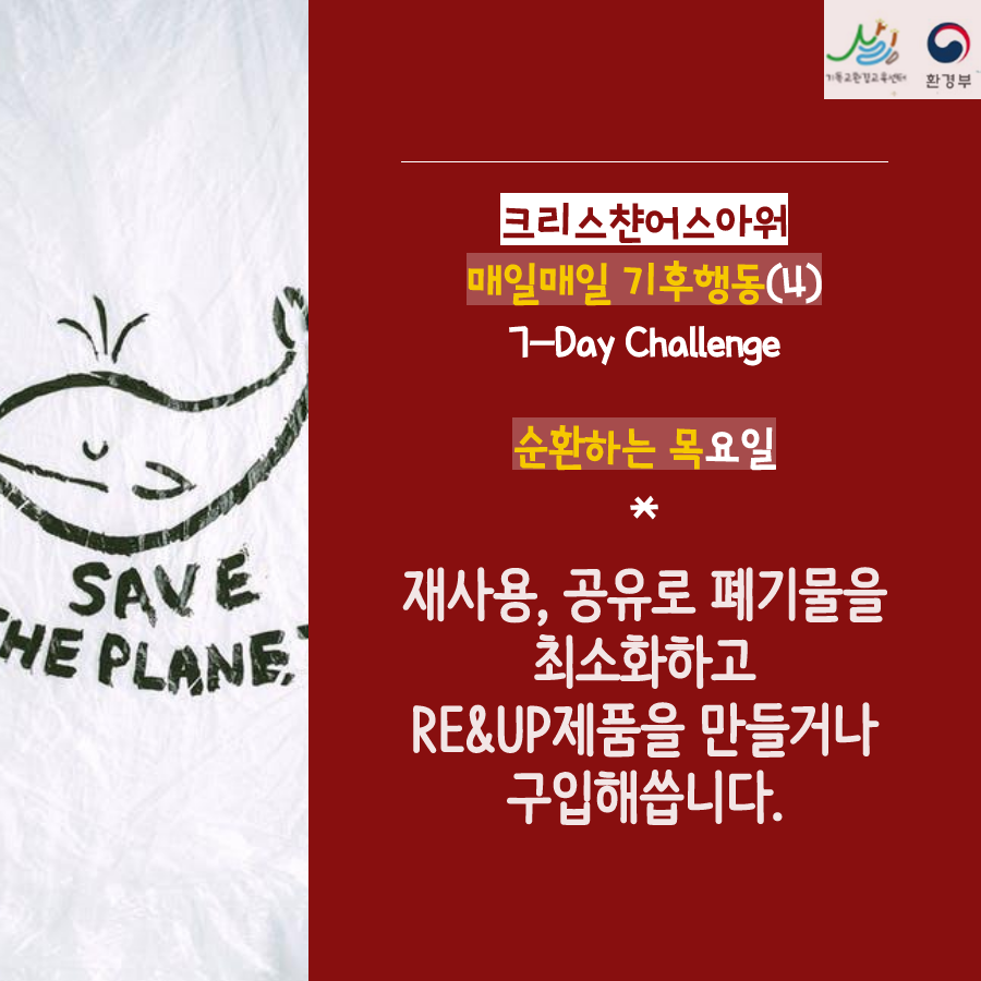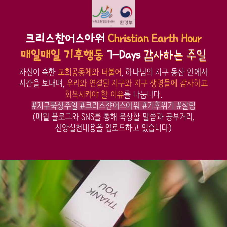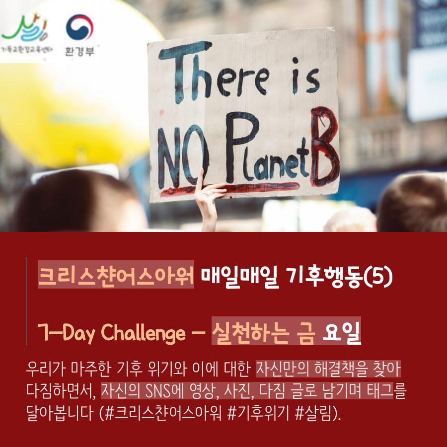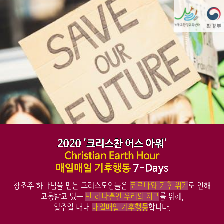 창조주 하나님을 믿는 그리스도인들은 코로나와 기후 위기로 인해 고통받고 있는 단 하나뿐인 우리의 지구를 위해, 일주일 내내 매일매일 기후행동합니다.