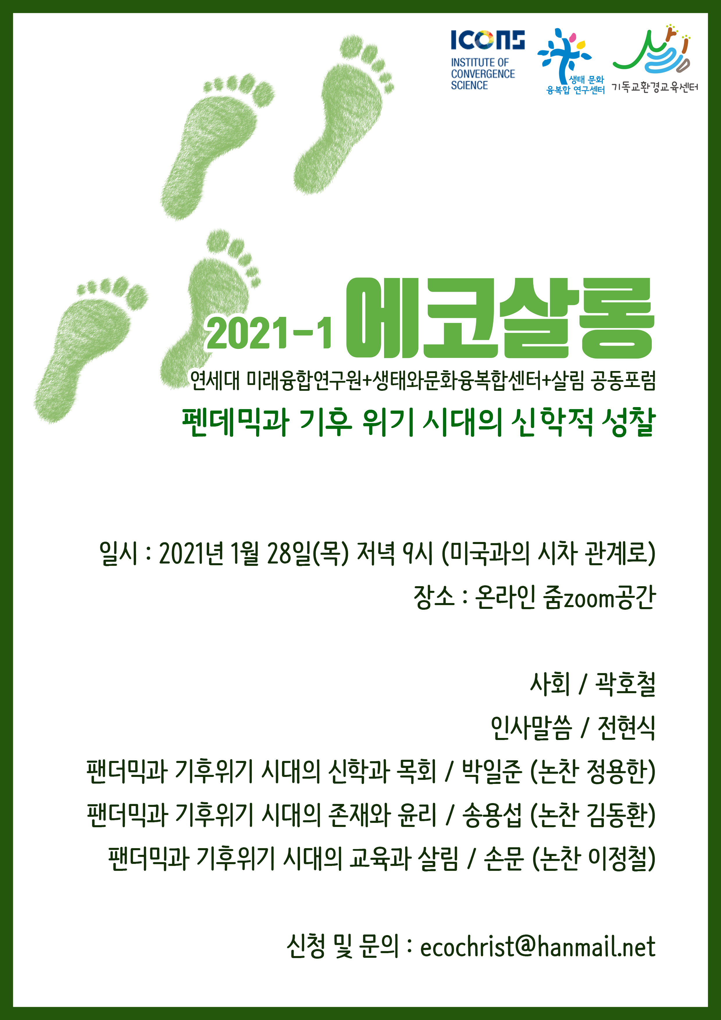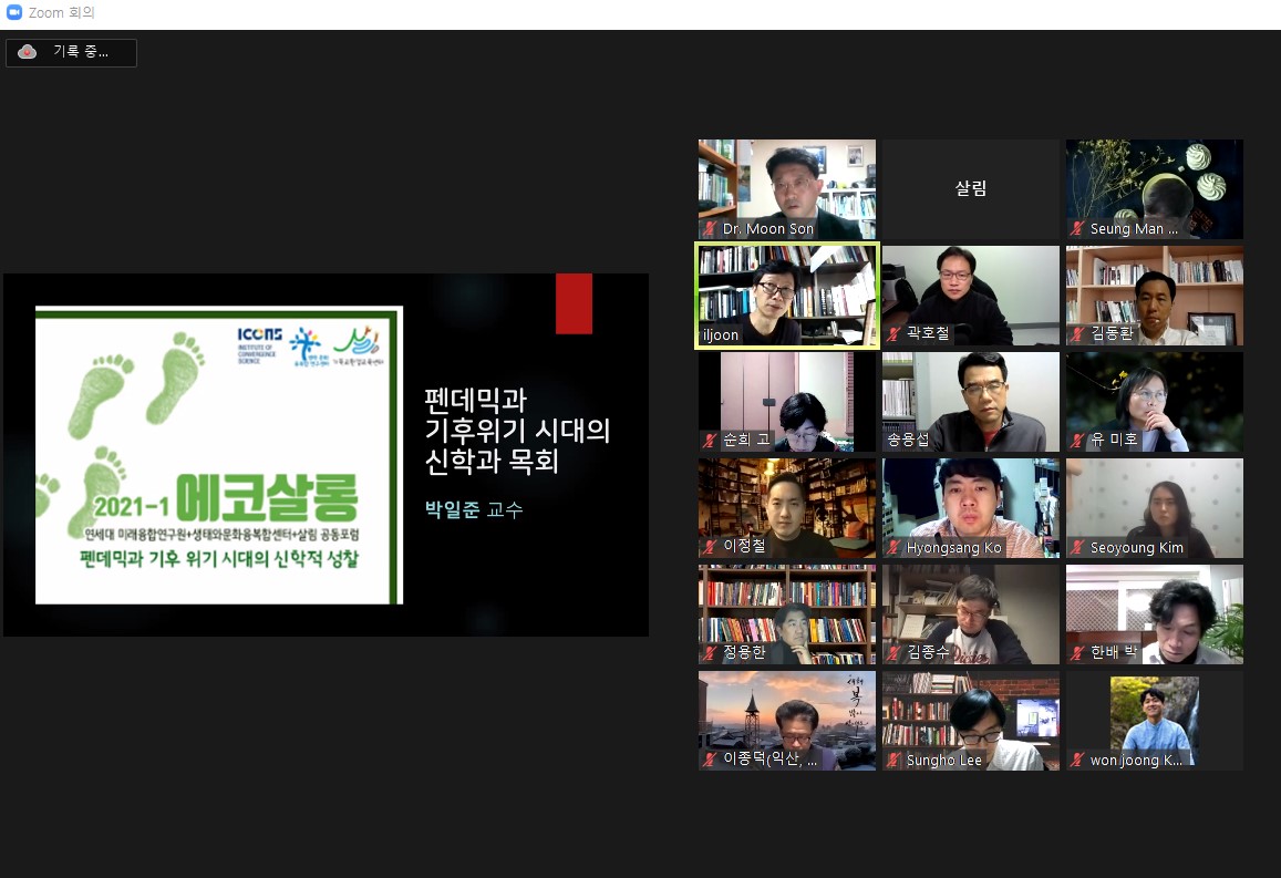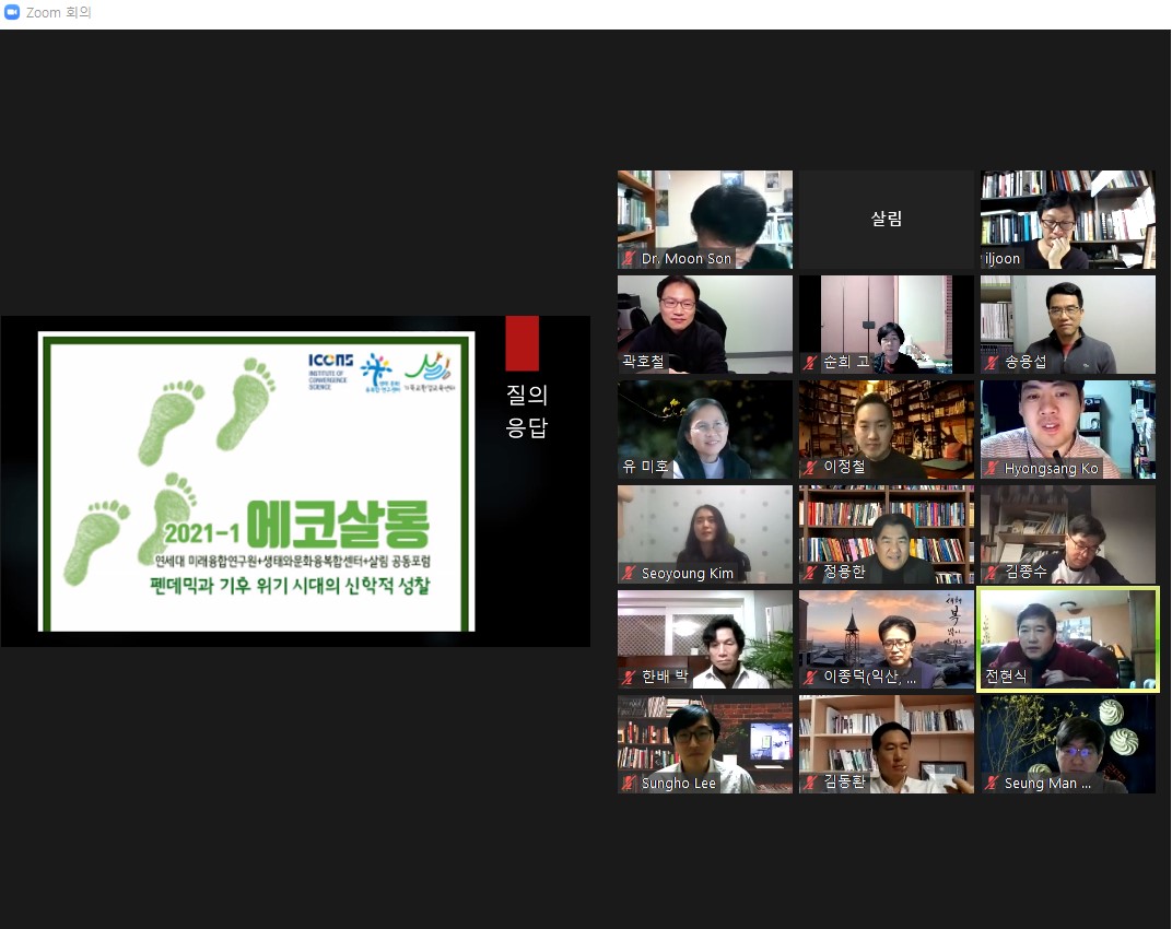 지난 1월 28일(목) 저녁 9시에, 온라인 줌zoom으로 <에코살롱>을 진행하였습니다. 연세대 미래융합연구원과 생태와문화융복합센터와 공동으로 진행한 이번 포럼은 “팬데믹과 기후 위기 시대의 신학적 성찰”을 주제로 하였습니다.