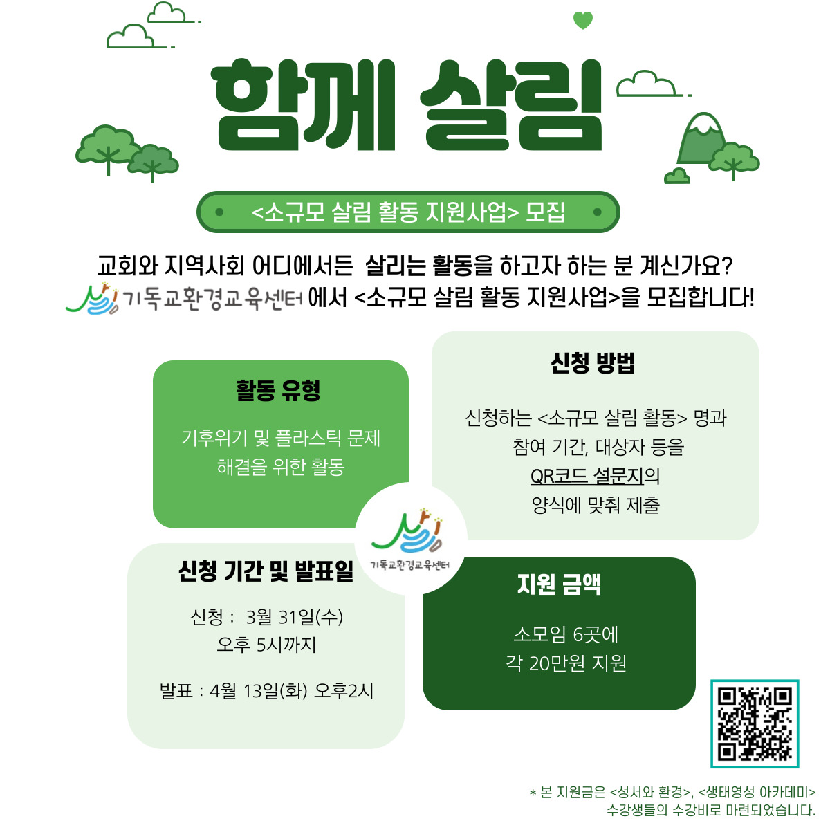 함께살림! 소규모 살림활동을 계획하는 분들에게 작은 지원금을 전합니다. 지원금은 살림이 진행하는 신현태교수님의 ‘성서와 환경’ 온라인강좌와 최광선교수님의 ‘생태영성 아카데미’