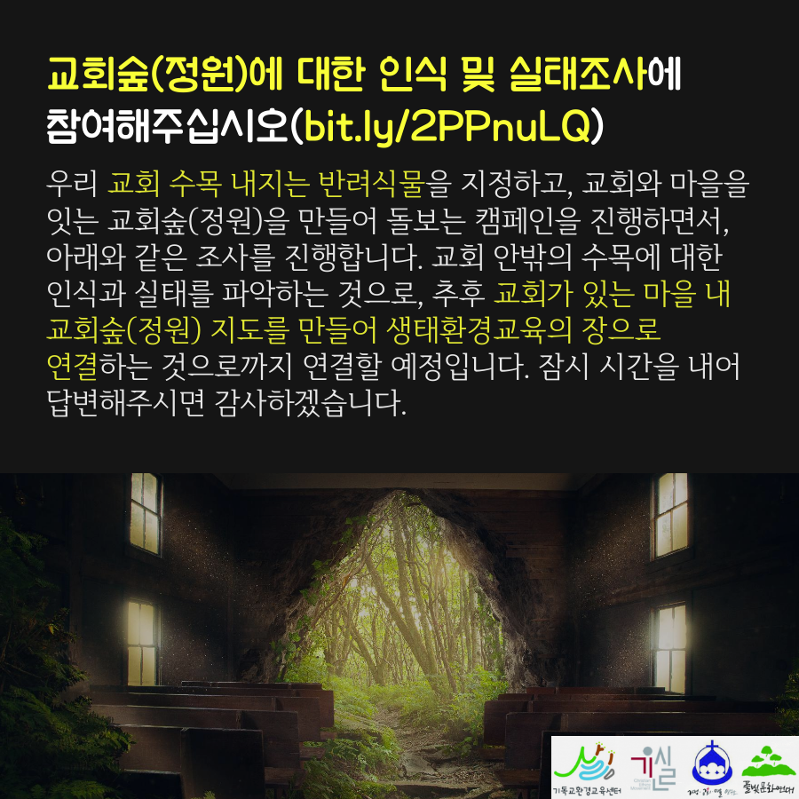 우리 교회 수목 내지는 반려식물을 지정하고, 교회와 마을을 잇는 교회숲(정원)을 만들어 돌보는 캠페인을 진행하면서, 아래와 같은 조사를 진행합니다.
