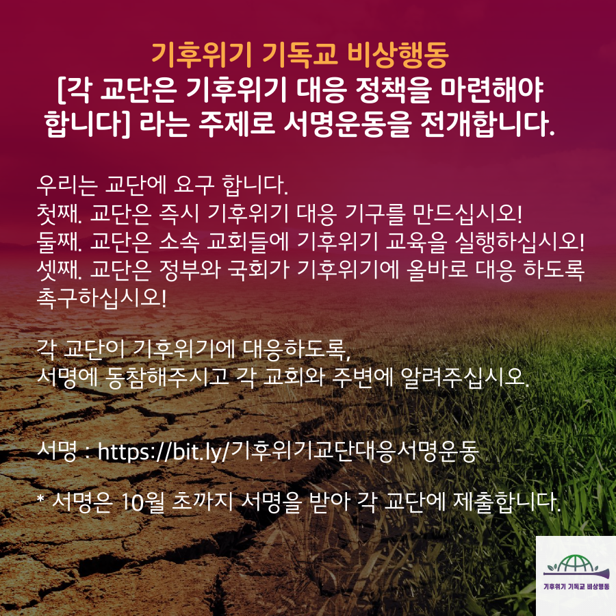 기후위기 기독교 비상행동에서, [각 교단은 기후위기 대응 정책을 마련해야 합니다] 라는 주제로 서명운동을 전개합니다.