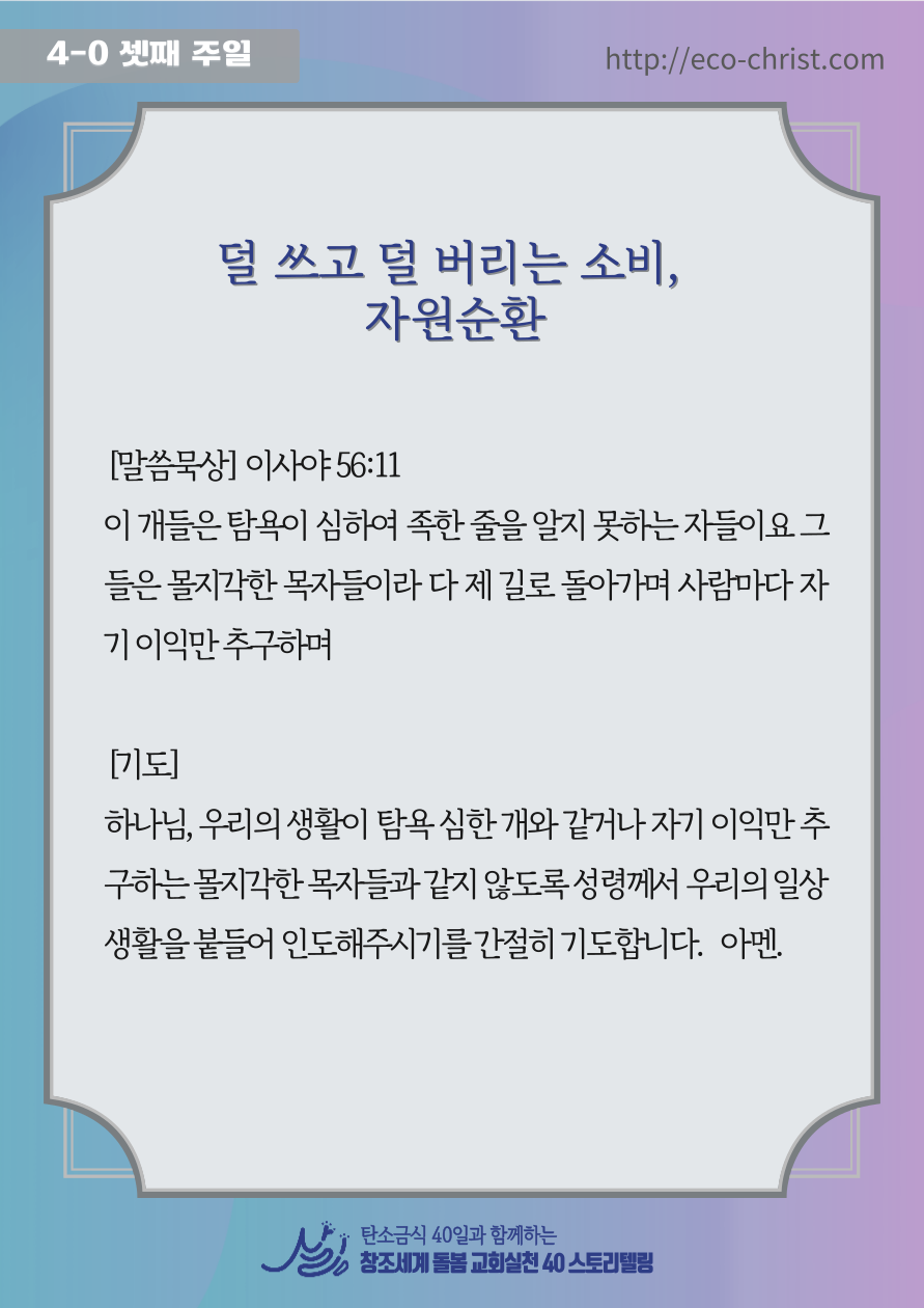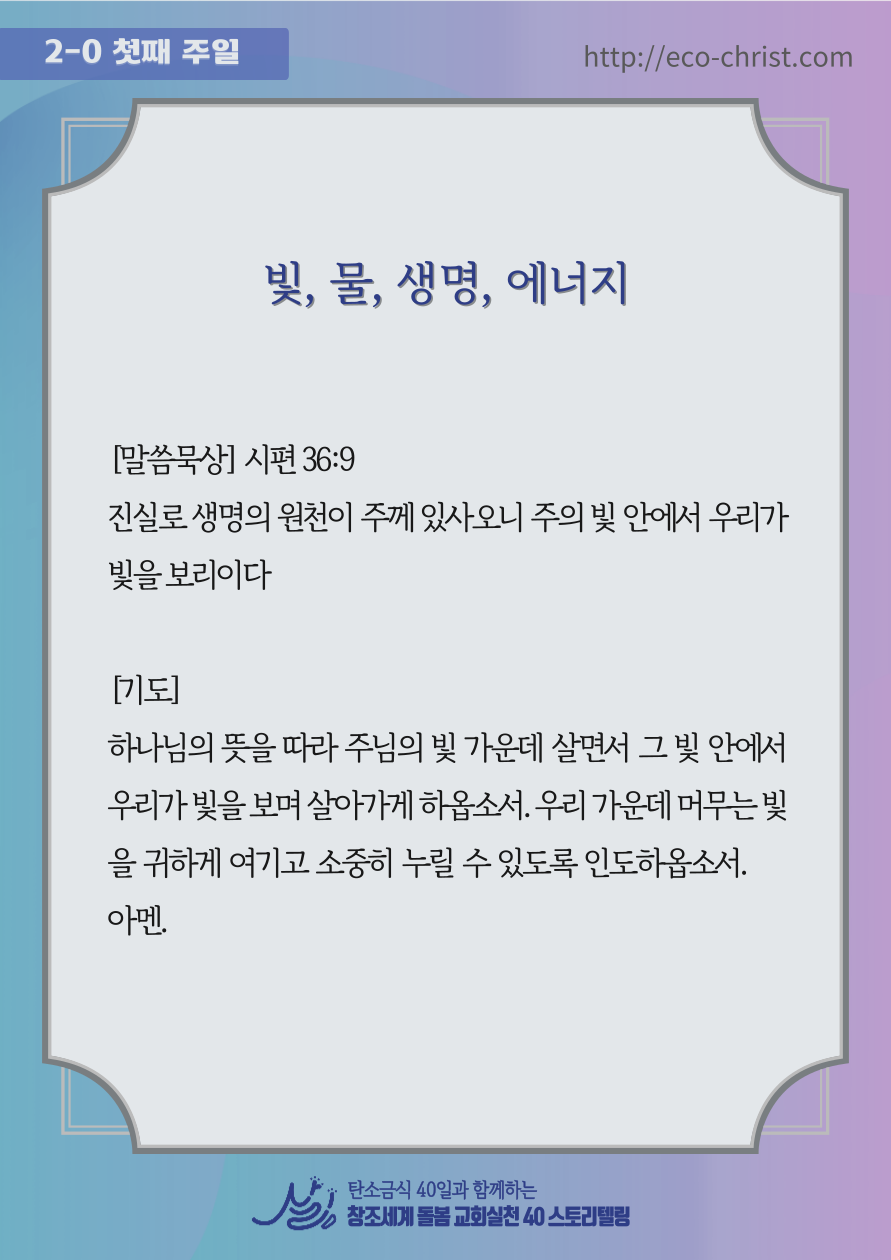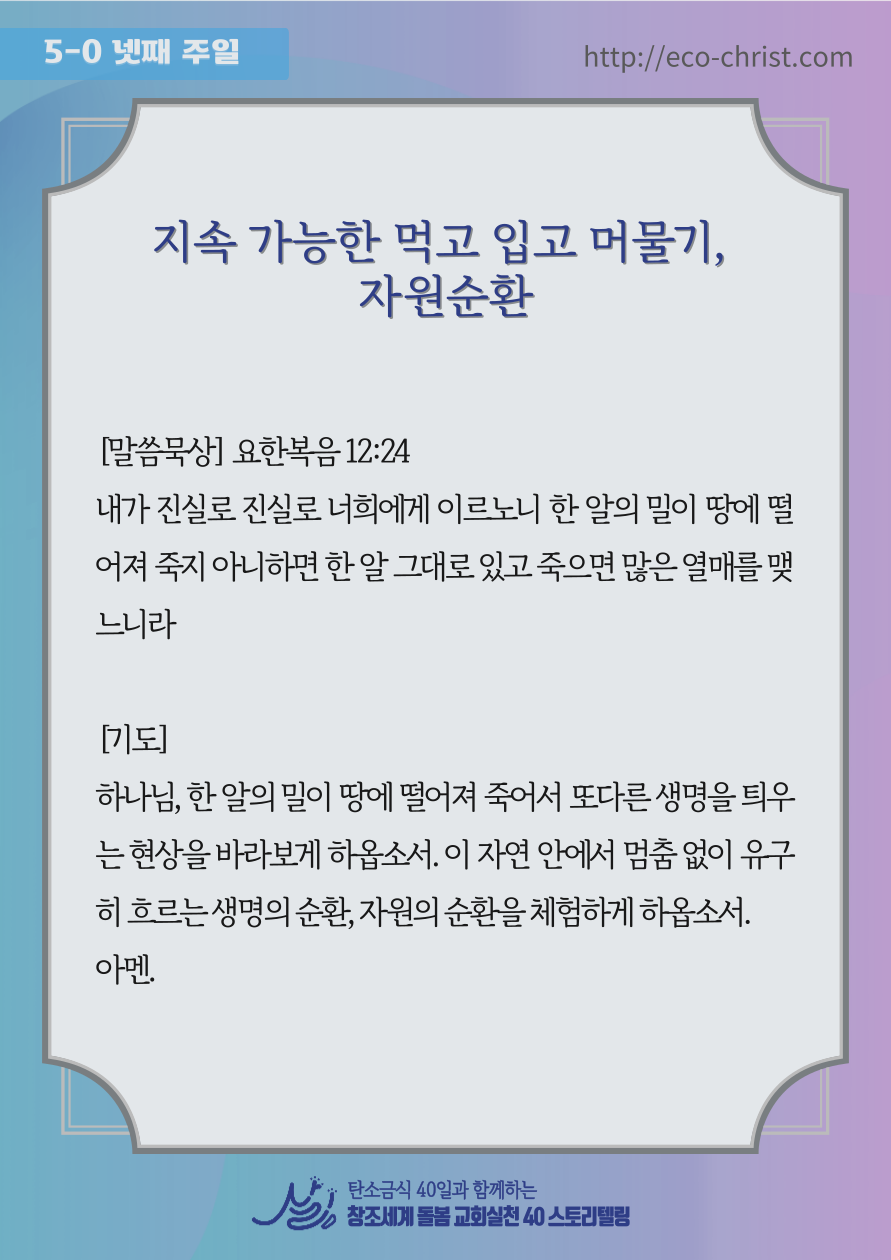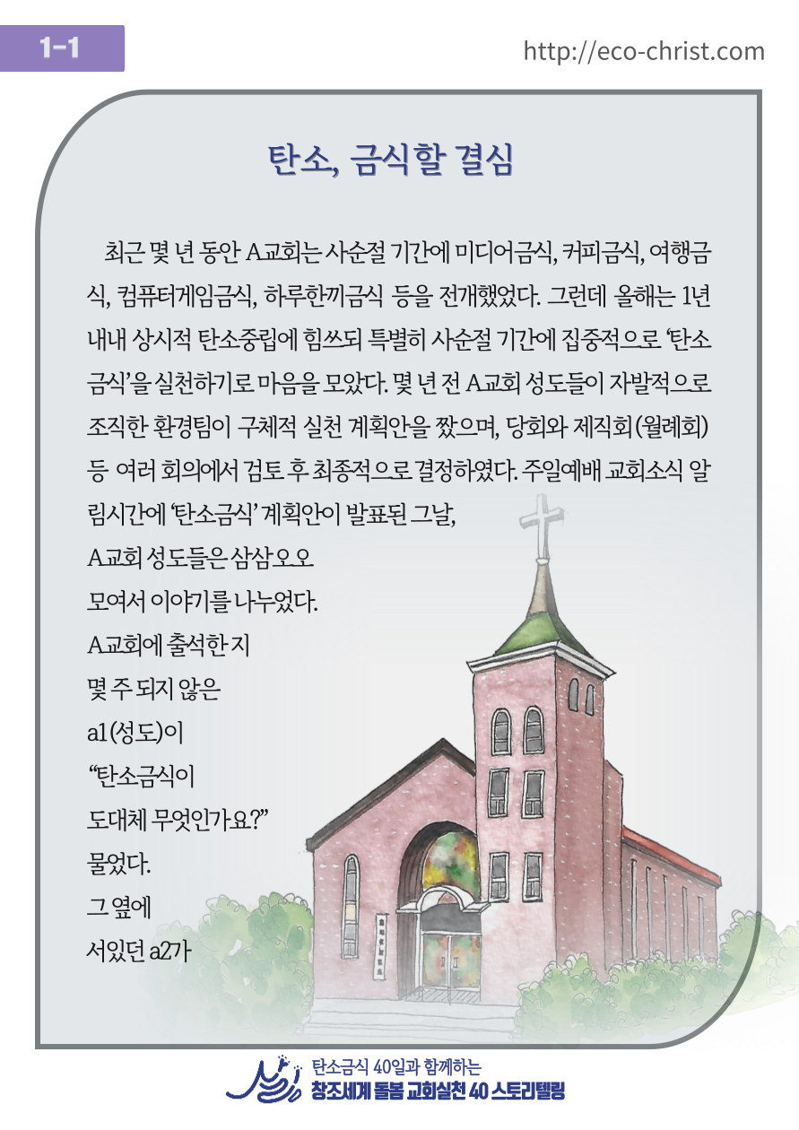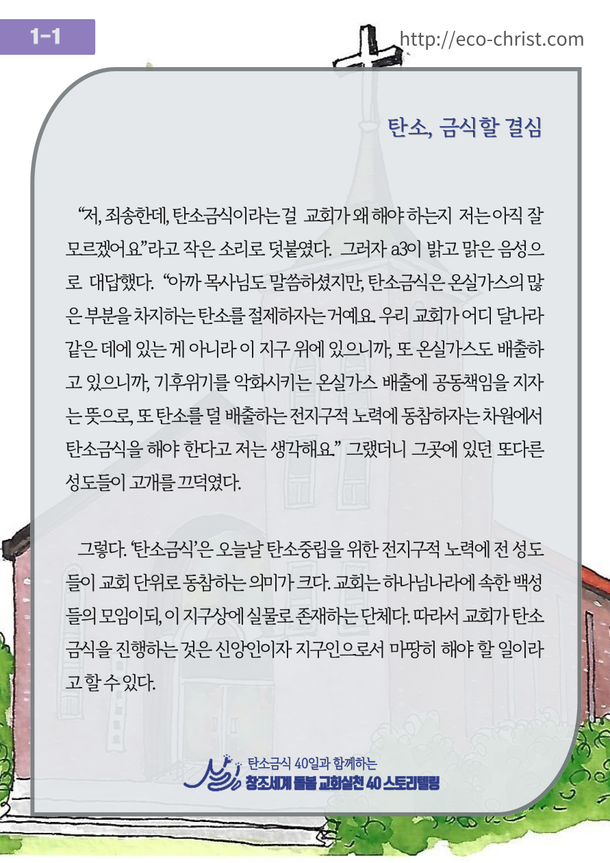 - 7주간 "교회학교 탄소금식" 주간별 카드 중 1주 카드 샘플 (클릭하시면 크게 볼 수 있습니다. 이밖의 2-7주의 교회학교 탄소금식 카드는 신청자들에게 온라인 카드 파일로 전송합니다)