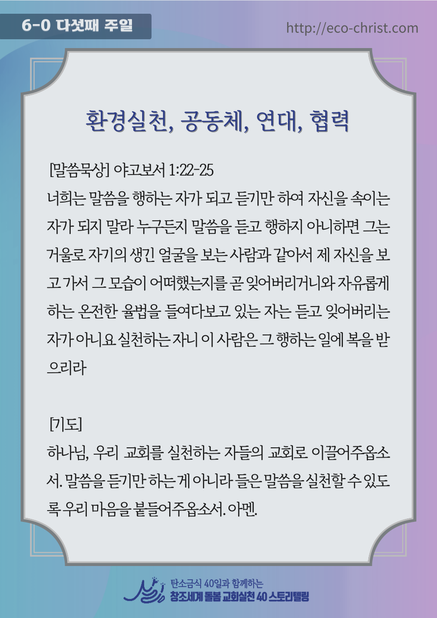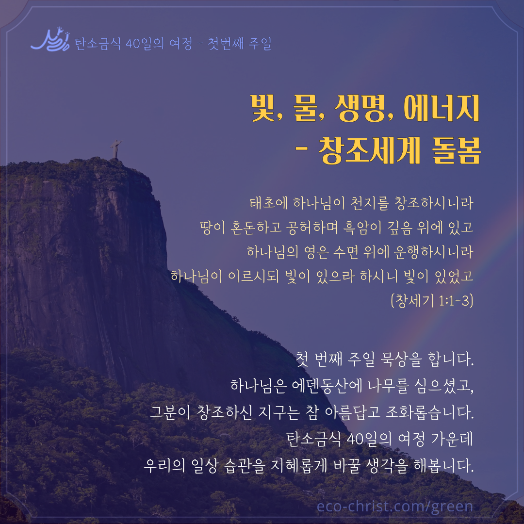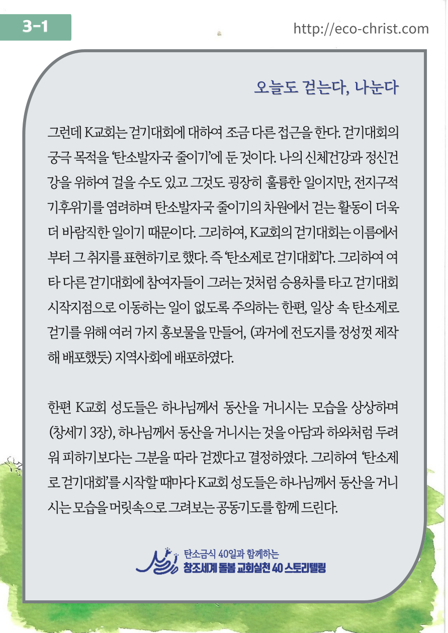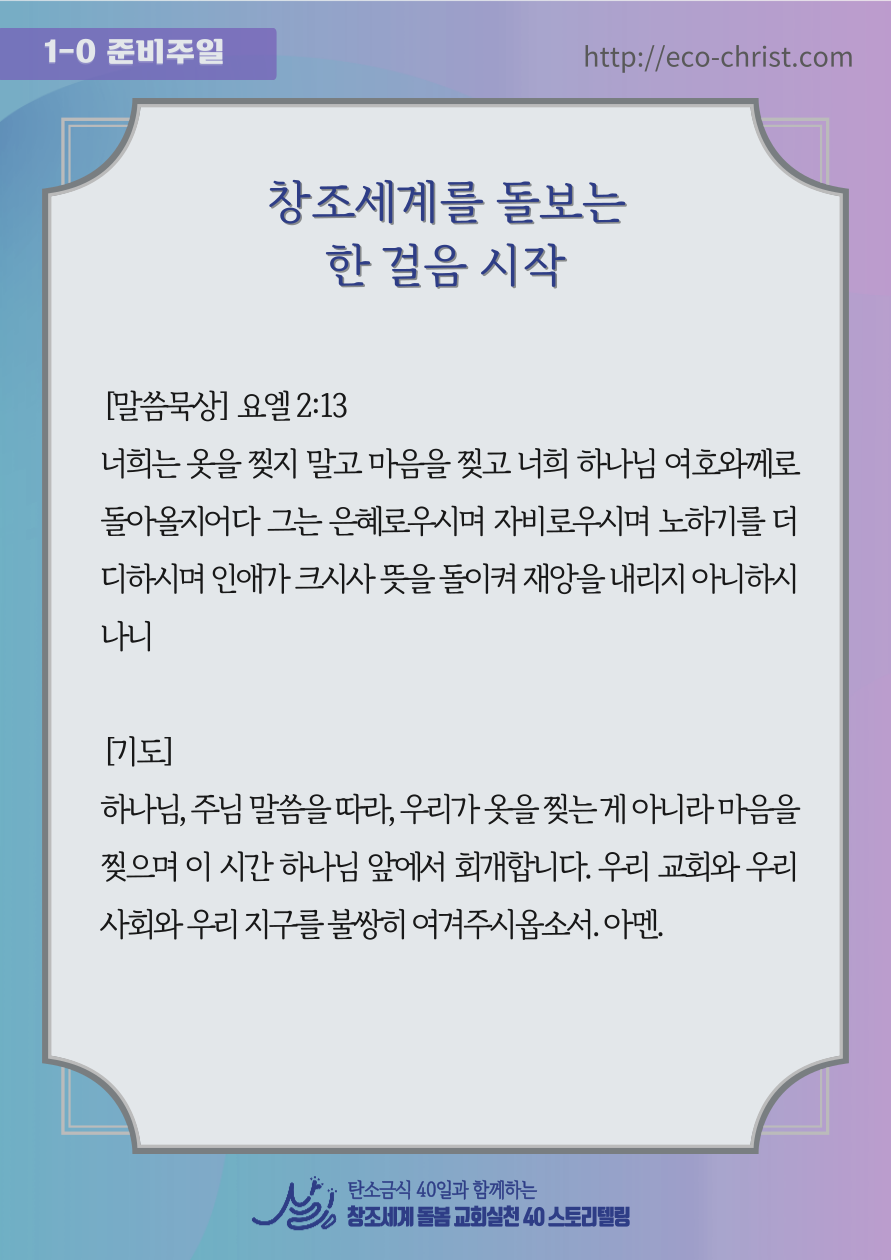 - 7주간 "교회학교 탄소금식" 주간별 카드 중 1주 카드 샘플 (클릭하시면 크게 볼 수 있습니다. 이밖의 2-7주의 교회학교 탄소금식 카드는 신청자들에게 온라인 카드 파일로 전송합니다)