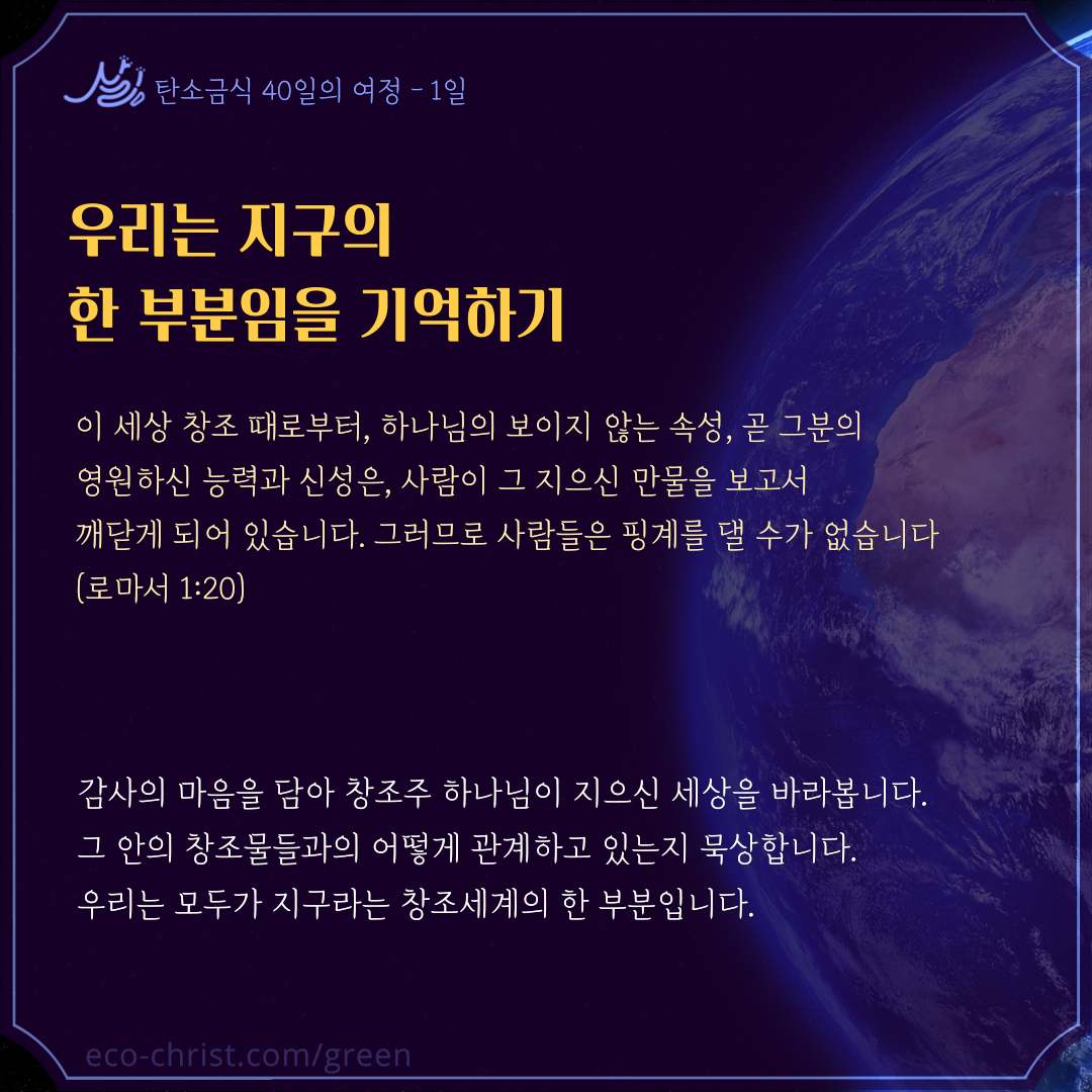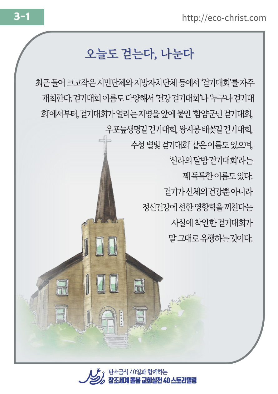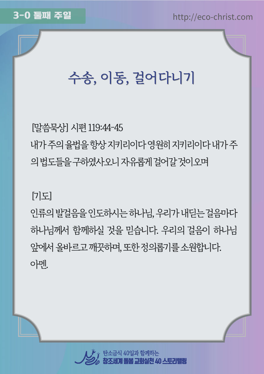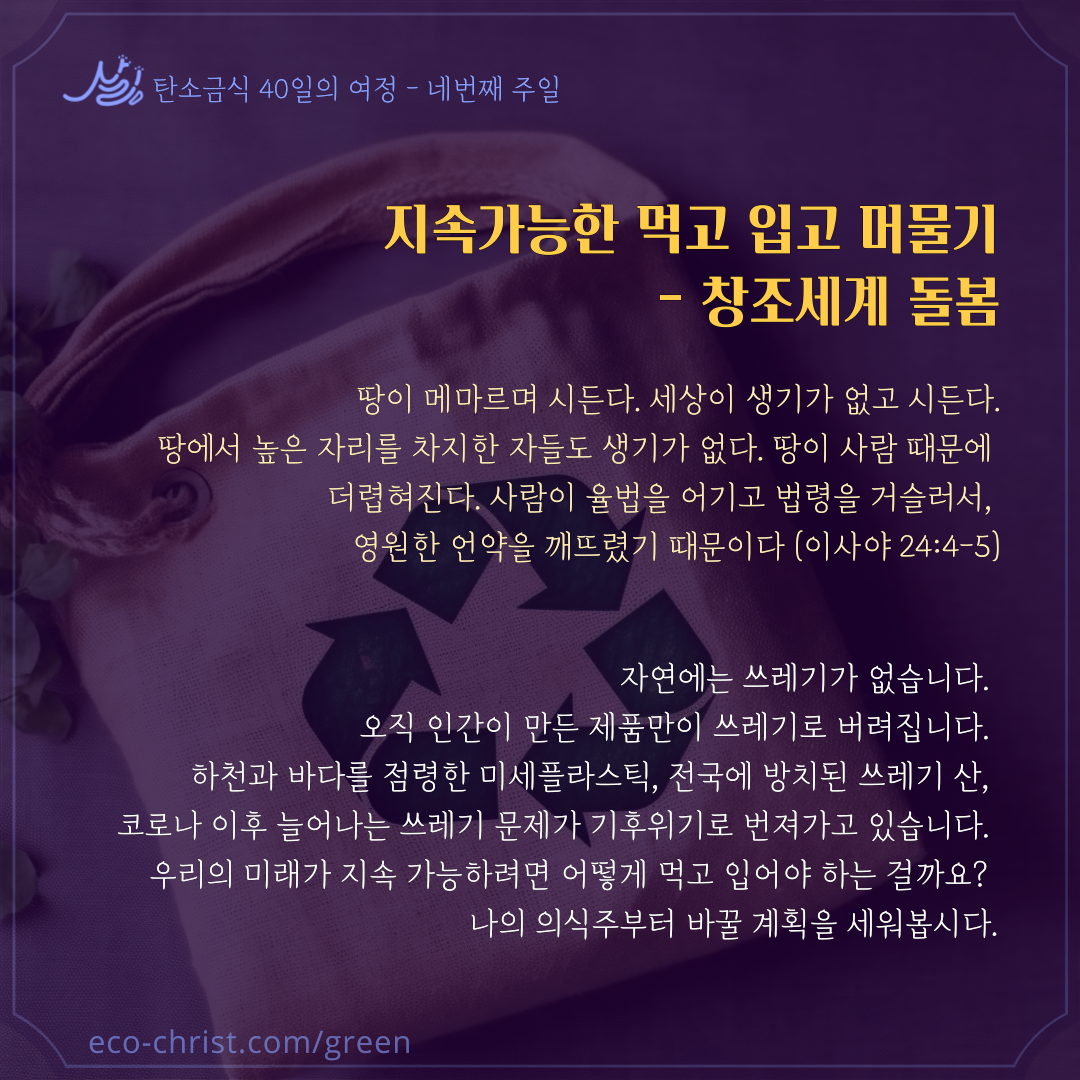 - 7주간 "교회학교 탄소금식" 주간별 카드 중 1주 카드 샘플 (클릭하시면 크게 볼 수 있습니다. 이밖의 2-7주의 교회학교 탄소금식 카드는 신청자들에게 온라인 카드 파일로 전송합니다)