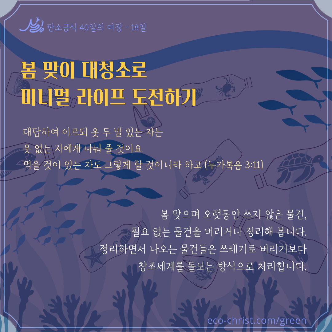 곧 우리의 마음을 대량의 탄소를 배출하는 육체의 욕망이 아닌, 자기를 낮추고 죽기까지 복종하신 주의 마음으로 바꾸어갈 수 있게 돕는 신앙의 절기, 사순절이다. ‘주의 심장’(빌1:8)으로 탄소발자국을 살피고, 경건에 이르게 하는 기도와 금식을 훈련해보자. ‘탄소를 덜 배출하고 플라스틱을 덜 사용하게 하는’ 탄소금식 캠페인에 참여하자. 함께하면 풍요와 편리함에 중독된 우리의 마음을 제어하는 데 도움이 될 것이다. 탄소금식을 한다는 건 무언가 더 하는 것이 아니라 마음과 일상을 살펴 비우는 것을 말한다. 받지 않아도 될 것, 사지 않아도 될 것, 가지 않아도 될 것, 하지 않아도 될 것을, 거절하거나 줄이거나 덜어내거나 모두를 위한 것으로 대체하는 것을 말한다. 지난 35년 동안 전문가들의 경고에도 불구하고, ‘더 이상의 것은 필요 없다’ 거절할 줄 모르는 가운데 필요 이상의 것을 먹고 입고 쓰며 욕심을 채워온 우리지만, 이제는 달라져야 한다. 그래야 우리가 산다.