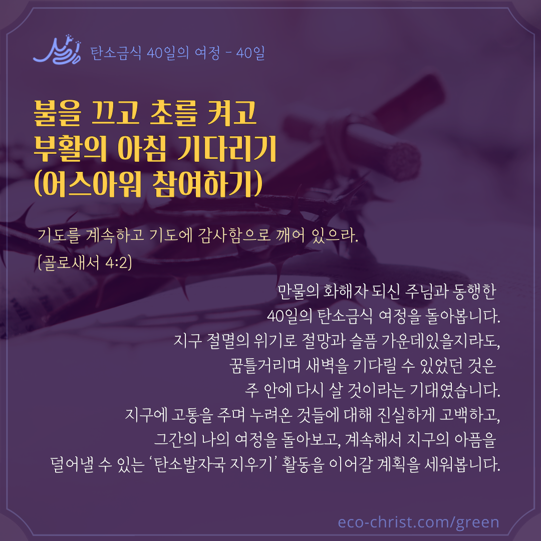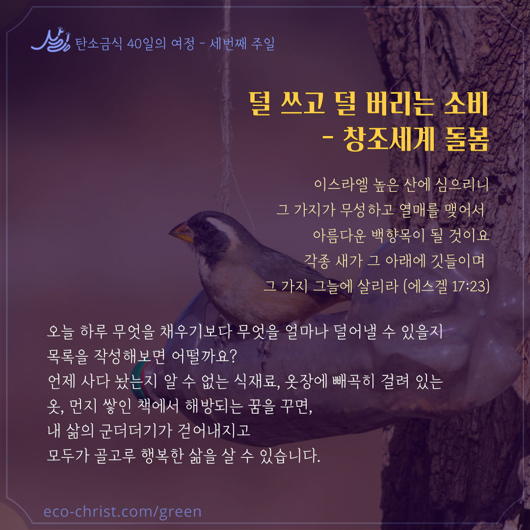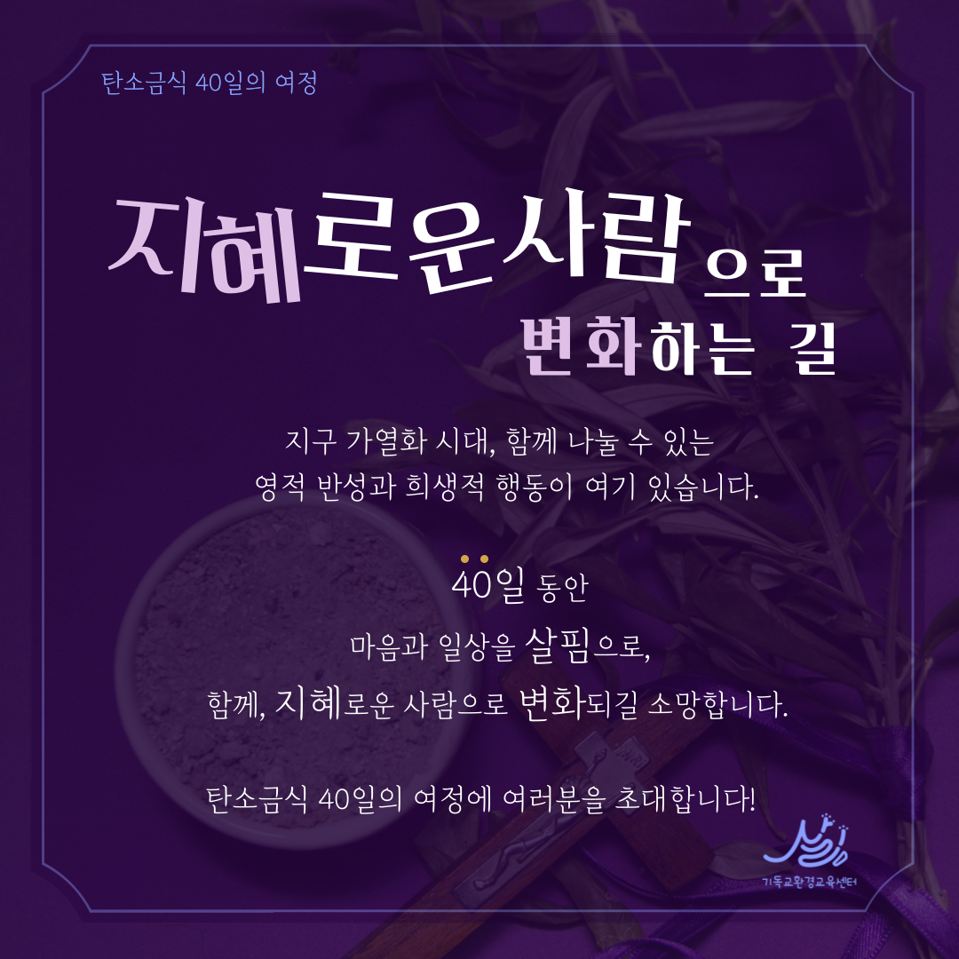 기독교환경교육센터 살림은 올해도 40일(7주간)의 탄소금식 카드를 무료로 나눔한다. 공동체 안에서 하루 혹은 주 단위로 변화를 시도하게 하는데, 교회의 경우 창조세계돌봄을 위한 교회실천 스토리텔링 활동으로 초대한다. 탄소금식을 통해 ‘경건의 모양은 있으나 능력은 부인하는’ 자가 되지 않도록 신앙을 새롭게 한다. 예수님의 고난을 피조물의 고통과 연계하여 묵상하게 하며, 창조주 하나님의 피조물에 대한 애끓는 마음을 경험하게 할 것이다. 그로써 허락받은 것 이상으로 탄소를 배출해온 것을 회개하게 하고, 기후위기와 동료 피조물의 고통을 신앙공동체와 함께 증언함으로, 자신은 물론 교회와 사회가 변화되게 할 것이다. 그리고 무엇보다 우리 안에 하나님의 말씀이 살아 움직이게 하여 ‘하나님의 사랑’이 온 세상에 드러내게 할 것이다. ‘2024 탄소금식 달력’을 활용하여, 일주일에 한 번씩은 자신의 영성을 점검하고 비움을 실천해보자(https://eco-christ.tistory.com/m/1833). 매일 덜어내고, 비우고, 나누는 실천을 한다면, 생명을 선택하는 기쁨과 은혜가 날마다 커질 것이다. 성령이 우리에게 내리시어 우리가 능력을 받고 땅끝에까지 이르러 주의 증인이 되기를 소망한다. 그러면 우리 안의 욕망은 비워지고 예수 그리스도의 생명이 채워지는 영적인 삶을 살게 될 것이다. <새가정 2024년 2월호 기고>
