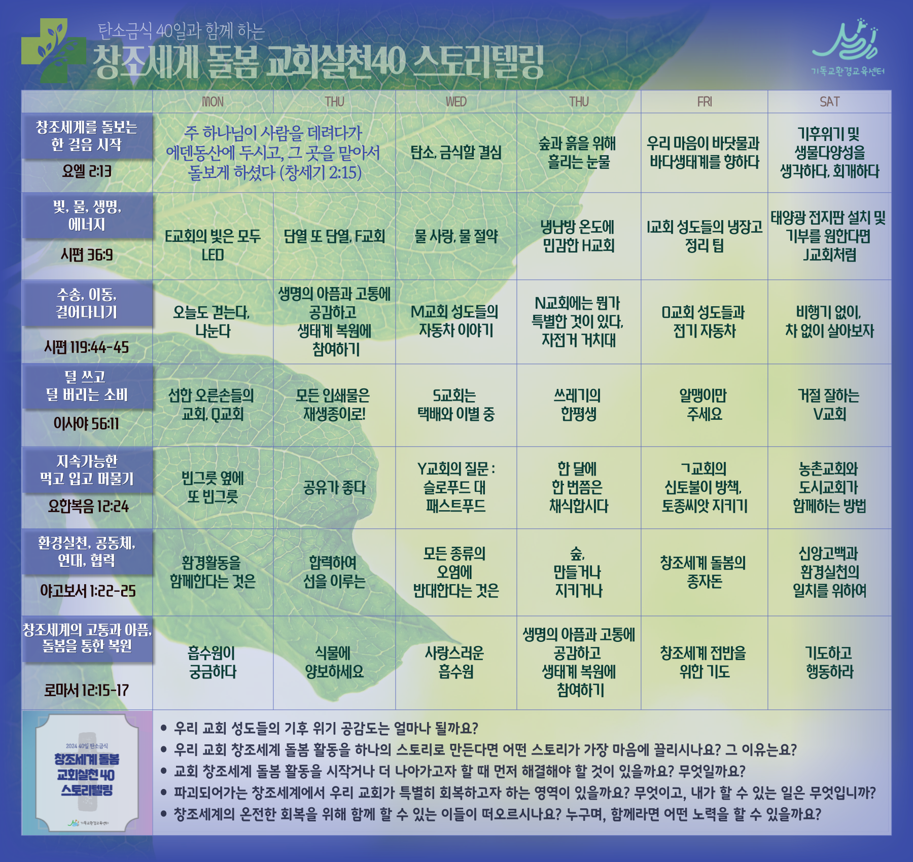 주일(7주간), '창조세계돌봄, 교회실천 스토리텔링' 카드 중 일부 (클릭하시면 크게 볼 수 있습니다. 매주 스토리텔링 하는 카드 외에 주제별 스토리는(총 40가지, 목차 참고) 별도 오프라인으로 구입하여 나눌 것을 권합니다. 신청링크에서)