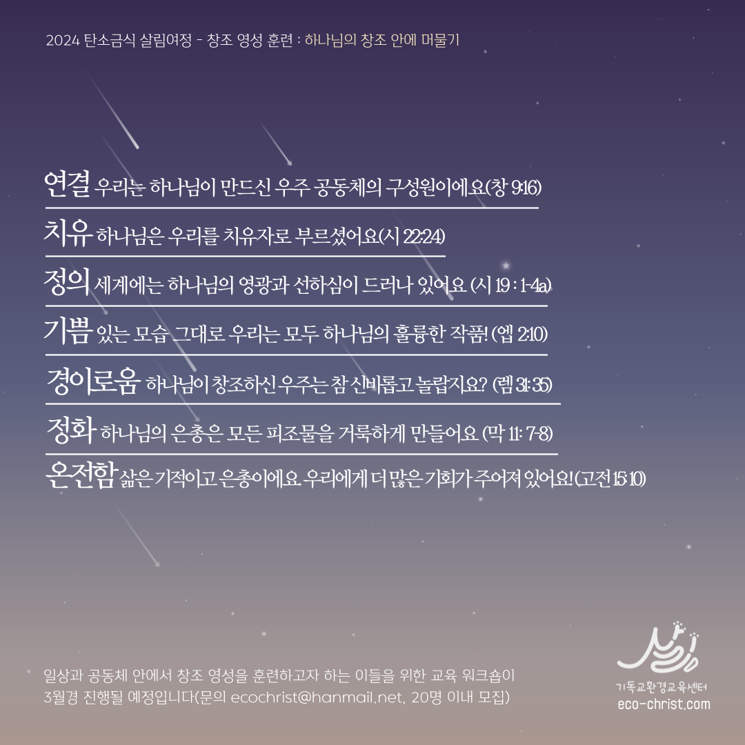 2024 탄소금식 살림여정 - "창조 영성 훈련 : 하나님의 창조 안에 머물기" (클릭하시면 크게 볼 수 있습니다. 아래 묵상자료는 2월 중순에나 완성될 예정이어서 추후 나눔할 수 있겠습니다.)